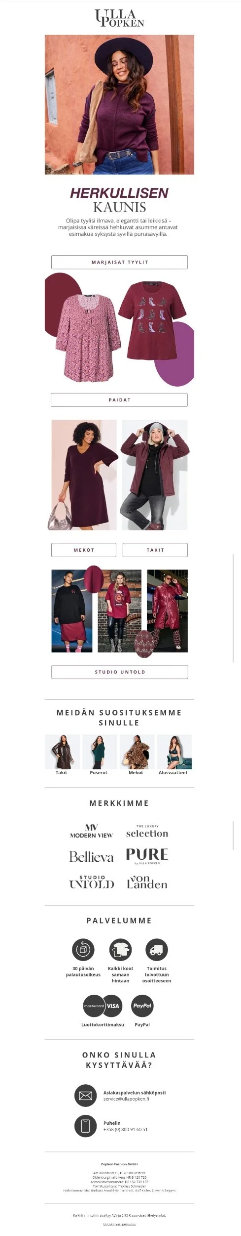 Suuri saksalainen pluskoon muotiin keskittynyt brändi Ulla Popken toimii myös Suomessa, ja olen osa heidän paikallista tiimiään. Vastaan Suomen markkinan digitaalisesta viestinnästä ja tarvittaessa myös muista tehtävistä, kuten markkinatutkimuksesta ja videoiden editoinnista. Työni keskiössä on johdonmukainen, ammattimainen ja brändiuskollinen sisältö, joka puhuttelee suomalaista yleisöä – sekä somessa että asiakasviestinnässä.